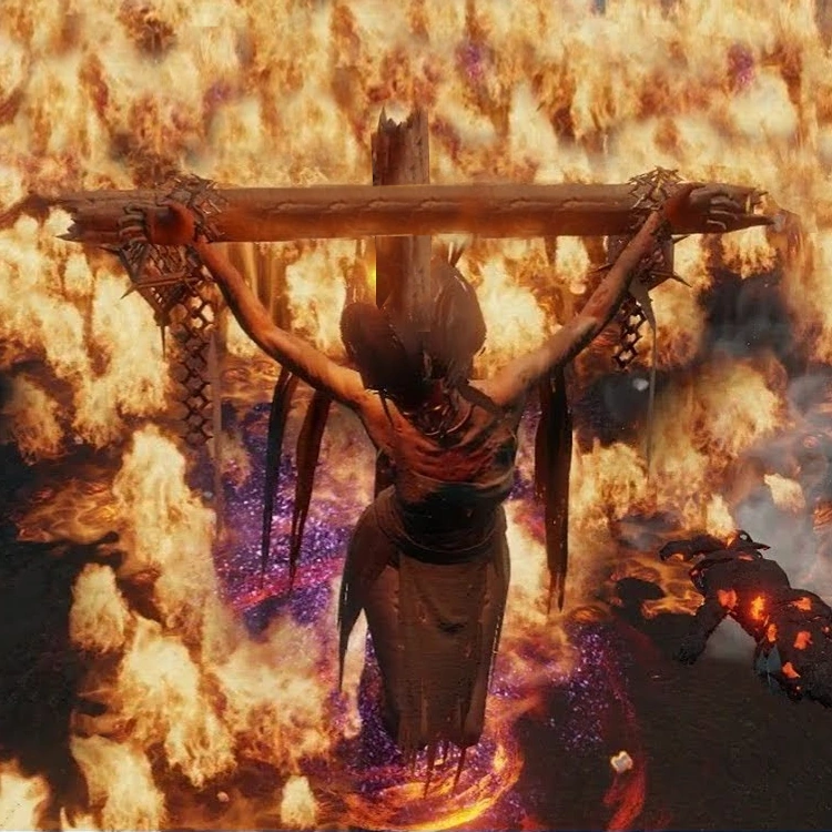 - Заклинания: аура боли (каждый ход наносит игнорирующий броню урон, снимается Благословением), первым действием призывает пять огненных тотемов (даже если предварительно потушить весь огонь вокруг неё), проклятый огненный шар, проклятье;