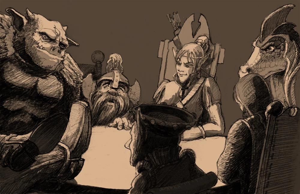 The Council of Seven is a unified council made up of magically-chosen representatives from each of the eight races created by the seven gods, minus the demon race; humans, dwarves, elves, lizards, imps, orcs and wizards. Although wizards are not in themselves a race, as their members come from those of the other races, the Council of Seven was so called as it "was easier to say than the 'council of six races and mishmash of magic users'".[1]